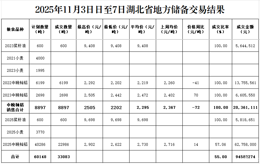 本周(2025年11月3日—11月7日)湖北无国家政策性粮食投放。
